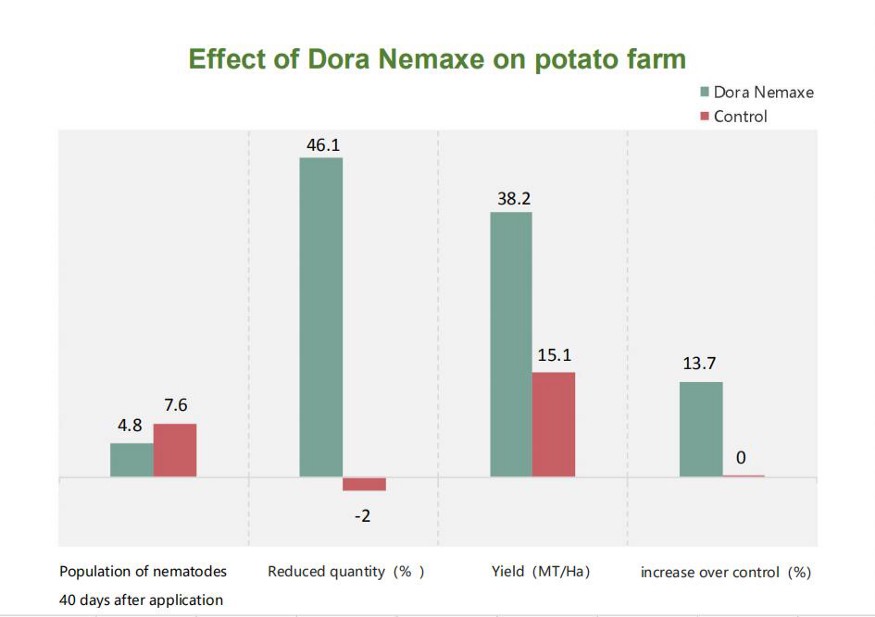 Dora Nemaxe used on potato, it have very good effect on reducing population of nematodes, stimulating healthy root system develop, increasing potato yields & quality.